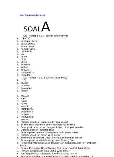soal test calon kepala desa.doc. Berikut adalah contoh soal tes perangkat desa, semoga dapat membantu bagi anda yang akan mengikuti tes perangkat desa. Kumpulan contoh soal contoh soal tes calon kepala desa 2019 pdf soal ujian matematika perangkat desa guru ilmu sosial. Kedudukan perangkat desa menurut pasal 1 angka 3 uu desa adalah 'pembantu' Prediksi soal tes perangkat desa dan kunci jawaban 2021 0615 54 komentar edit.