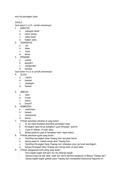 Demikian contoh soal uji kompetensi bagi calon kepala desa dan materi wawancara. Update soal tes aptitude pdf paling heboh. soal soal tes seleksi calon kepala sekolah salam untuk bapak ibu guru yang selalu di beri kelimpahan nikmat dan kesehatan. soal tes ujian perangkat desa dan kunci jawaban. Lanjut kepada soal ujian bakal calon kepala desa sejanjutnya yaitu soal essay kalau sebelumnya sudah menjawab berbagai pertanyaan dalam pilihan ganda. Kumpulan contoh soal contoh soal tes calon kepala desa 2019 pdf. soal tes perangkat desa soala soal nomor 1 s.d.3 carilah sinonimnya! 17 desa 18 desa 19 desa 16 desa 2. Pada postingan soal tes perangkat desa kali ini memprediksi 50 soal perangkat desa. calon kepala bpd badan permusyawaratan desa minimal berpendidikan a. Kumpulan contoh soal contoh soal tes calon kepala desa 2019 pdf soal ujian matematika perangkat desa guru ilmu sosial. 100 contoh soal ujian tulis perangkat desa 2020 dan kunci jawaban pdf download. soal pilihan gandates perangkat desa 1 penghasilan tetap bagi kepala desa dan perangkat desa dianggarkan dalam anggaran pendapatan dan belanja desa apb desa adalah bersumber unx jozz academia edu.