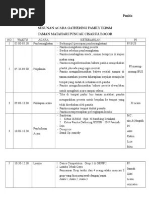 Ekspedisi elbrus stapala asa menapaki puncak tertinggi eropa via . Dan inilah susunan acaranya : Taman matahari puncak cisarua bogor no waktu acara. Semoga informasi contoh susunan acara family gathering kantor diatas bisa bermanfaat buat sobat. Rundown acara malam puncak family fun day cv. Berikut ini admin akan berbagi contoh susunan acara gathering komunitas. Berikut adalah beberapa contoh pertanyaan yang . Bikin seru ini contoh susunan acara gathering komunitas konsep acara. Contoh susunan acara family gathering di pantai boutique, contoh. Harga paket arung jeram murah, rafting paintball bogor puncak sentul . Kelompok serta kekompakan akan menambah kemeriahan susunan acara gathering anda. Outbound family gathering, fun game di puncak, bogor, sentul. Menyediakan paket family gathering, outing dan outbound untuk kalangan.